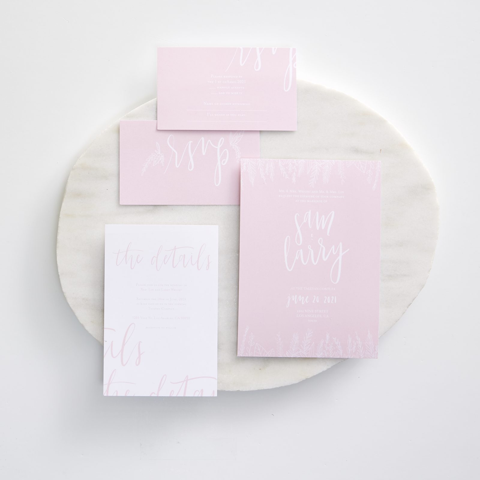 The details card is one of the most important pieces of any suite, no? Why not make it stand out with an inverted color scheme from the invitation, with a white background and blush writing. This details insert has “the details” in calligraphy, with it as an accent piece of the same calligraphy cut off slightly at the bottom of the card. The content remaining on the card is written in a digital serif font. Paper size: 4×6 inches