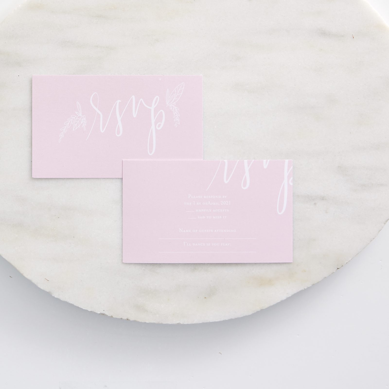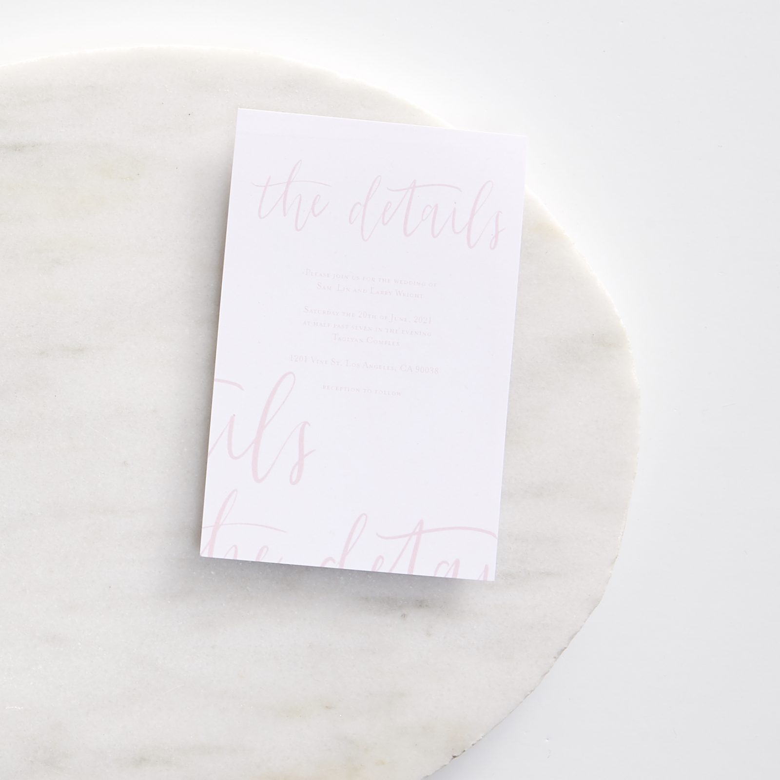 The details card is one of the most important pieces of any suite, no? Why not make it stand out with an inverted color scheme from the invitation, with a white background and blush writing. This details insert has “the details” in calligraphy, with it as an accent piece of the same calligraphy cut off slightly at the bottom of the card. The content remaining on the card is written in a digital serif font. Paper size: 4×6 inches
