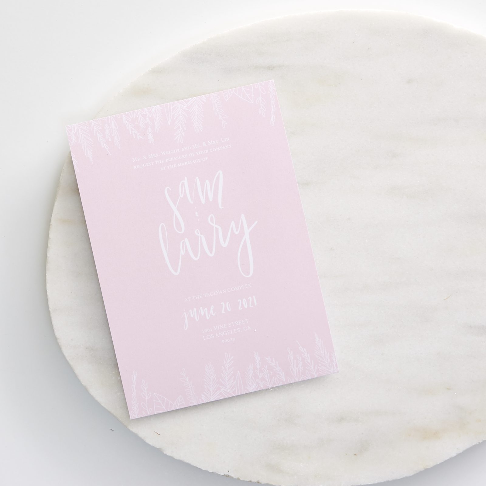 This invitation is as elegant as it comes, with the couple’s name in calligraphy as well as the date. The top and bottom of this invitation is dressed with simple greenery in a beautiful white pencil sketch. This look is perfect for a spring wedding, especially outdoors. The details remaining on the invitation is written in a digital serif font. Paper size: 5×7 inches